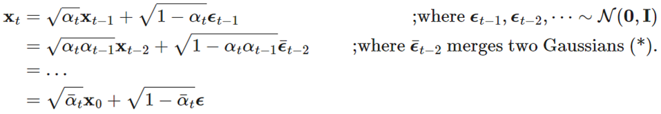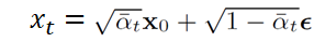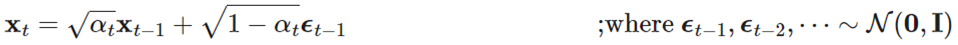 추가적으로 더 정리하자면, q( xt | x0 ) 계산 파트에서 정리된 아래 수식에 의해,