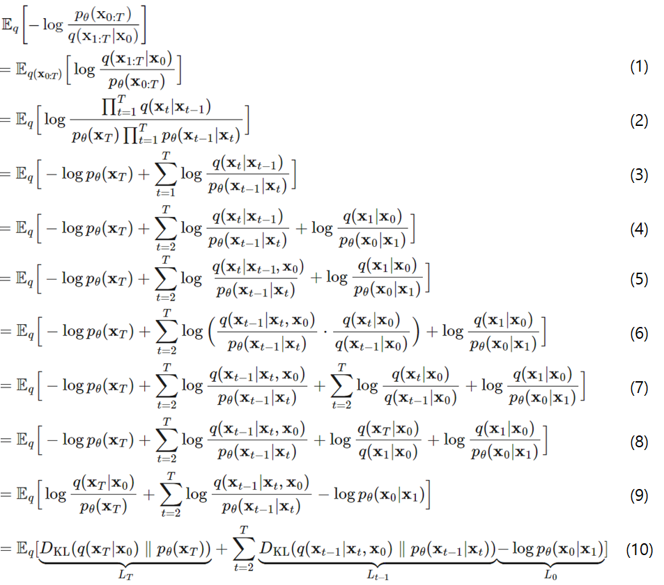 (5) 계산 가능하게 수식을 풀어주기 위해, 시그마(Σ)가 있는 수식 분자인 q의 prior에 x0를 추가해줍니다. 해당 q에 관한식은 prior가 x0로 부터 오기 때문에 같은 수식입니다. 최초 Diffusion Model(2015)에 Appendix B.3에는 단순히 Markov process에 의해서라고만 표기되어 있습니다.