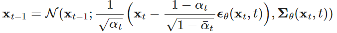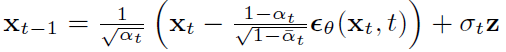 XT는 가우시안 분포(=정규 분포)를 따릅니다. t가 1보다 크면 z(=xt)는 가우시안 분포를 따르고, 아니면 0 이 됩니다. t-1번째 이미지는 t번째 이미지와 학습된 ϵθ에 의해 생성되어 집니다.