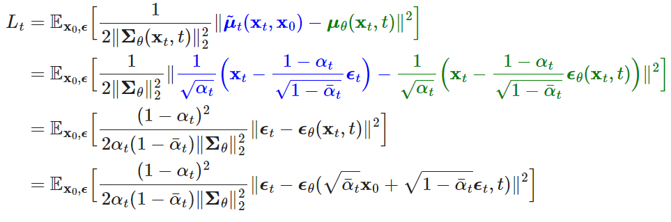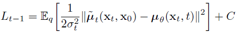 마지막 수식에서 표준편차(σ)는 학습 parameter가 없어서 상수가 되므로 버리고, q(xt-1|xt,x0)의 평균(μ)과 pθ(xt-1|xt)의 평균(μ)에 대해 위 식이 최소화가 되도록 pθ 네트워크를 학습시키면 됩니다. 때문에 Loss는 아래와 같이 정리 됩니다.