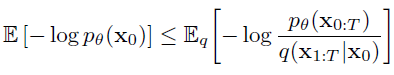 아래는 VAE(Variation Auto Encoder) 기본 개념서 내용(link)입니다. x0 대신 x 가 사용되고 xT 대신 z가 사용되었습니다. log앞에 마이너스가 빠졌습니다. 아래 수식에 한해서만 다시 최대화 문제입니다.