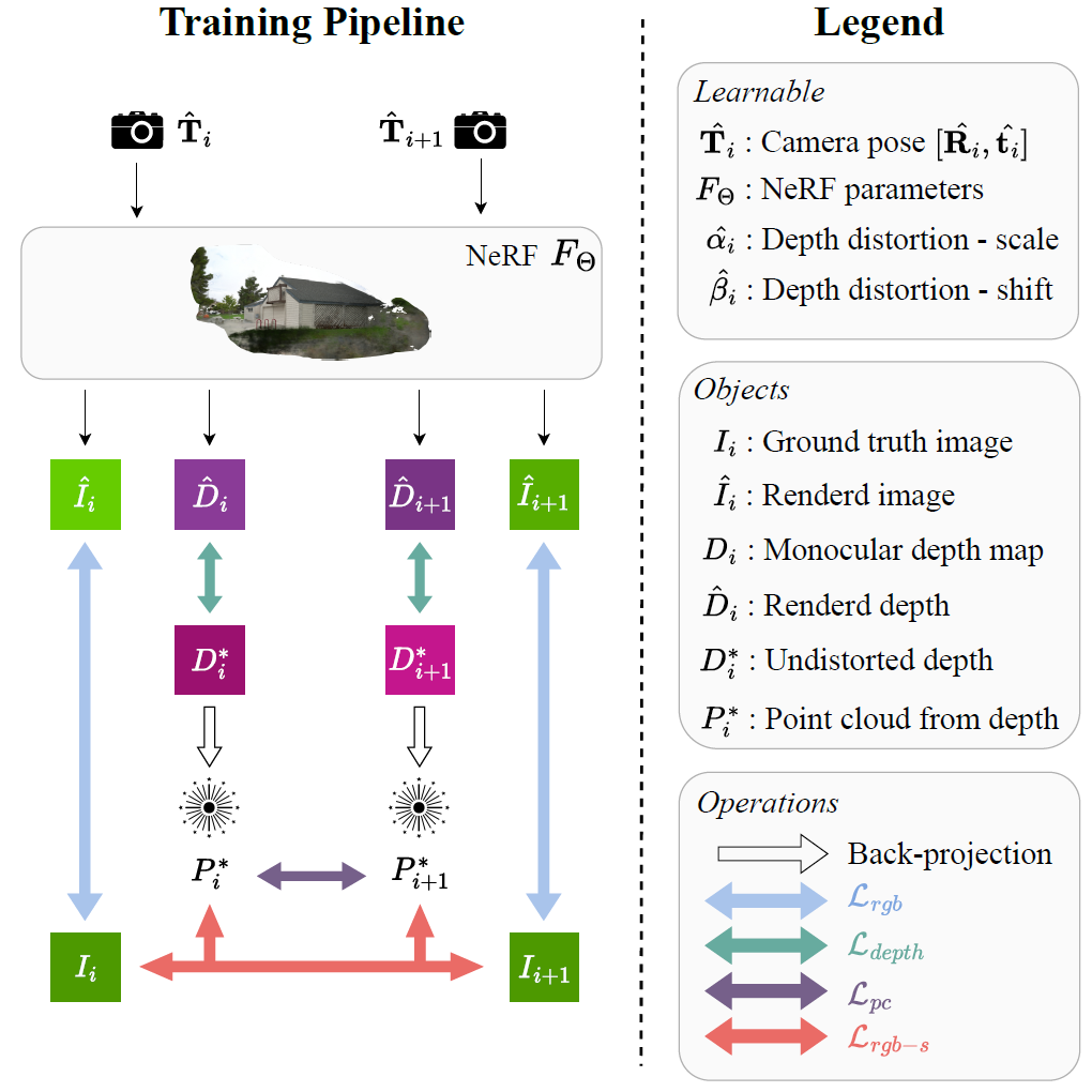 - scale과 shift distortion을 explicitly하게 모델링하여, mono-depth를 unposed-NeRF training에 사용했습니다.