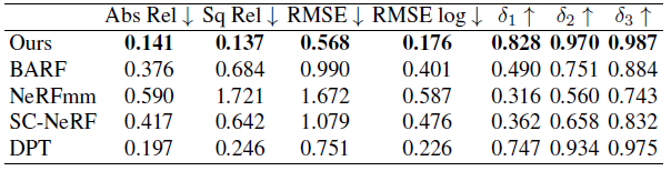 모든 평가지표에 대해서 높은 성능을 보였습니다. 심지어 전처리에 사용했던 Mono Depth Estimation인 DPT보다 좋은 성능을 보였습니다.