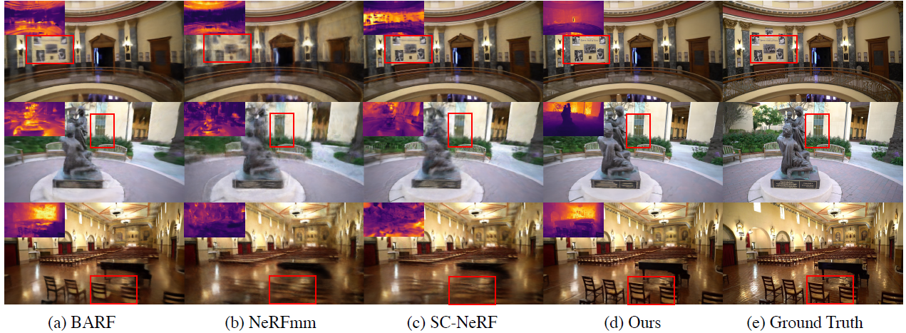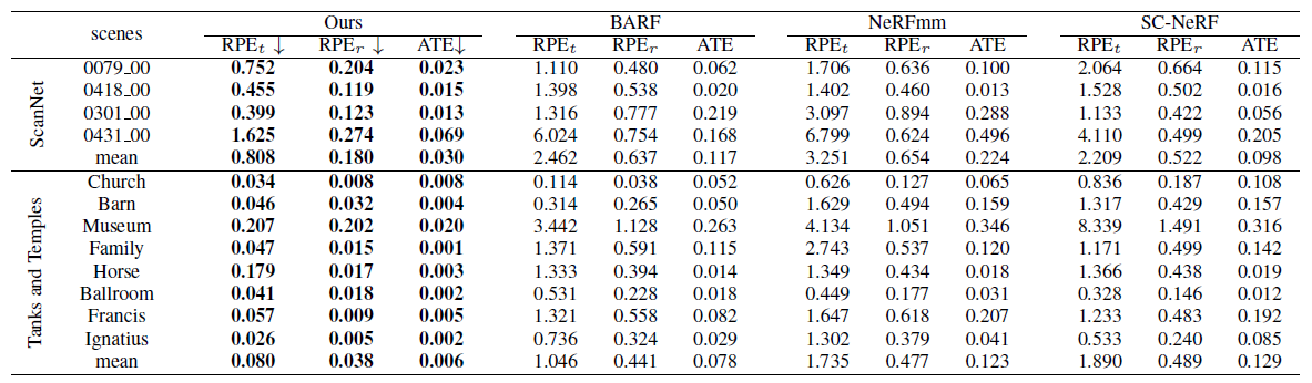 COLMAP 결과를 GT로 두었고, SC-NeRF, NeRF--, BARF와 비교하였습니다. 모든 Scene에 대해서 높은 성능을 보였습니다. (그림이 작아서 잘 안보이는데 COLMAP결과가 빨간색이고 평가 대상 모델이 초록색입니다.)