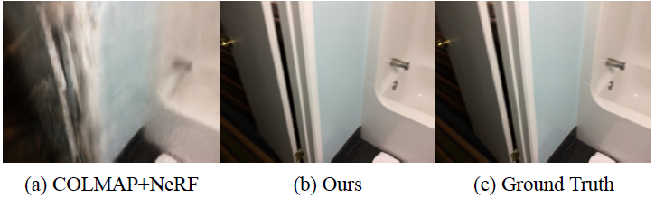 COLMAP은 low-texture scene에서 성능이 안좋다고 알려져 있어서, 정확한 카메라를 획득하지 못하는 경우가 발생합니다. 이로인해 low texture 에서 COLMAP+NeRF로 학습할 경우에 Artifacts가 발생합니다. 아래는 이에 대한 예시 그림입니다.