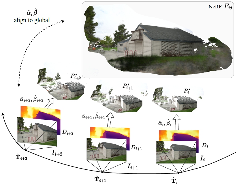 위 그림은 Camera Pose T에 대한 RGB 이미지 I와 Depth Estimation한 Depth Map D, 이를 back-projection한 Point Cloud P 그리고 NeRF Model FΘ을 α, β parameter로 alignment하는 것을 보여줍니다. 이러한 parameter들을 기반으로 어떤 Scene에 대한 카메라 Intrinsic값을 가진 Image I 들이 주어졌을 때, 카메라 Extrinsic Parameter T와 NeRF Model FΘ를 최적화시키는 방법을 소개하고 있습니다.