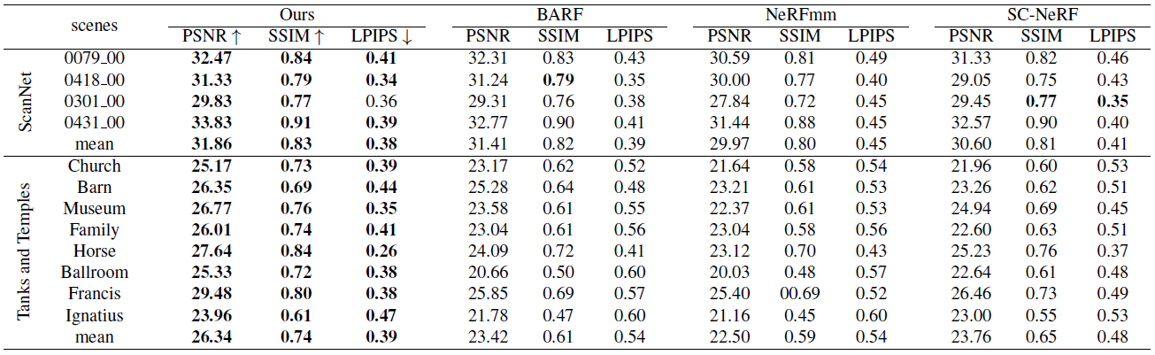 모든 경우에 높은 성능을 보였습니다. 이전에 리뷰하였던 Point-NeRF(CVPR202) 에서는 Camera Pose가 주어진 상태에서 학습되었고, Tanks데이터셋에서 평균 PSNR 29.61 / SSIM 0.954 / LPIPS 0.080 이었고, ScanNet 데이터셋에서는 평균 PSNR 30.32 / SSIM 0.909 / LPIPS 0.220 이었습니다. NoPe NeRF가 Camera Pose가 주어진 Point-NeRF보다는 좋지 않은 성능을 보입니다.