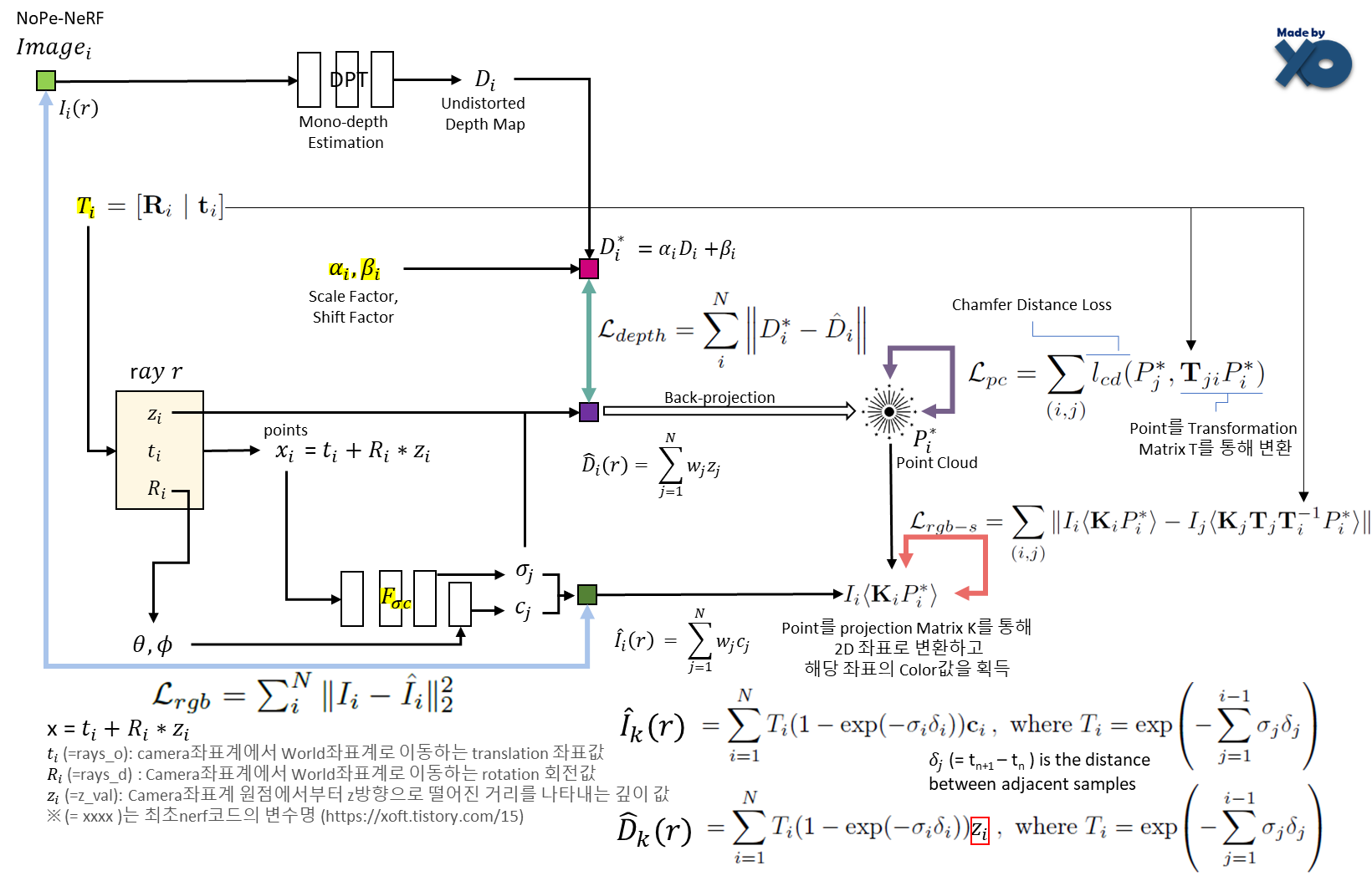 기존 NeRF에서는 GT RGB Image와의 RGB Loss(하늘색 화살표)만으로 NeRF FΘ 모델을 업데이트 했었습니다. NoPe-NeRF도 RGB Loss는 동일합니다.