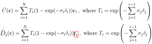 이를 NeRF통해 prediction된 depth map D^는 논문상에 위의 오른쪽 식과 같이 되어 있는데, discrete한 수식은 아래와 같습니다. C(r)에 대해서는 최초 NeRF Color Rendering 파트 참조 바라며, D(r) 에 대해서는 Nicer-SLAM 의 Loss부분에 설명 참조 바랍니다. ti는 1개 ray위의 sampling된 points들의 깊이 값을 나타냅니다.