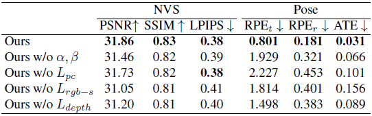 Effect of NeRF Losses(5번째줄) : depth-map에 대한 distortion 최적화(=α, β 업데이트)는 inter-frame loss만으로 수행됩니다. 이로 인해, 누적 오차(drift)가 발생하고 pose accuracy가 낮아집니다.