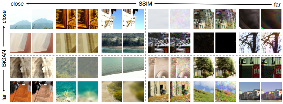 - Fig 11에서, deep method인 BiGANs[13]과 low-level metrics인 SSIM의 퀄리티를 비교하였습니다. BiGAN이 유사도가 멀리 떨어지도록 인식하지만 SSIM은 가깝다고 인식하는 pair들은 일반적으로 blur를 포함하였습니다. BiGAN은 correlated noise pattern을 SSIM보다 적은 distortion으로 인식하는 경향이 있었습니다.