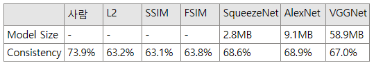 오른쪽 그래프를 보면, VGGNet은 상대적으로 low capacity인 SqueezeNet과 AlextNet 보다 더 좋은 성능을 보였습니다. 이 결과를 통해 Network가 perceptual judgment를 배울 수 있다는 것을 증명하였습니다.