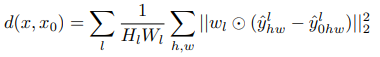 - L은 레이어를 의미하고, h,w는 각 layer에서 height, width이고, y, y0는 채널 차원에서 unit-normalize한 feature vector입니다. w는 Scale Factor이며 모두 1로 사용합니다. y,y0에 대해 채널 단위로 L2 Loss를 구하여 모든 layer에 대해 Sum해줍니다.