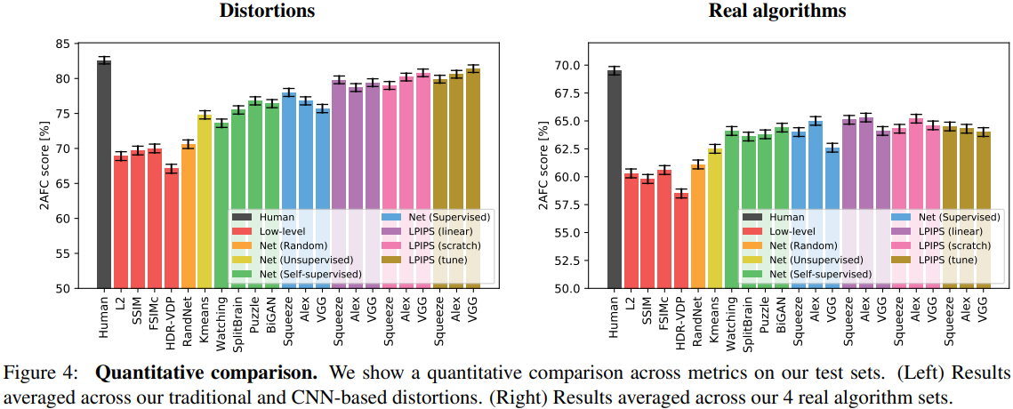 - 위에 언급한 Figure 4는 다양한 low-level metrics(빨강)와 deep networks, human ceiling(검정)의 performance를 보여줍니다. 왼쪽은 2개의 distortion test sets (traditional+CNN-based) 으로 평균낸 점수이고 오른쪽은 4개의 알고리즘 밴치마크 (superresolution, frame interpolation, video deblurring, colorization) 로 평균낸 점수입니다. 6개 test set을 평균하였습니다.