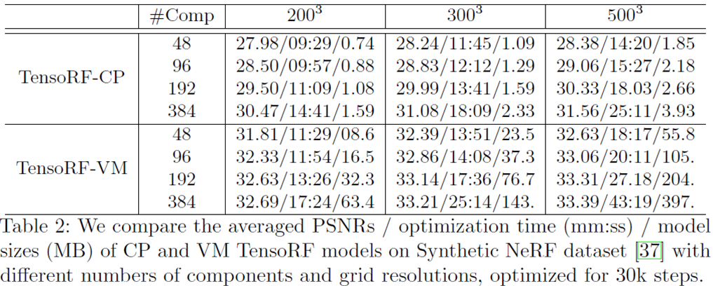 Grid 사이즈 N_0^3에서 N^3까지 점점 증가시키면서 학습 (N0 = 128 , N=300)이라고 했었는데, N을 조절하였을 경우, rank components 갯수를 조절하였을 경우의 실험 결과입니다. Grid사이즈를 증가시킬 경우에 성능이 더 좋은 것을 볼 수 있으며, CP보다 VM이 성능이 더 좋고, rank components의 갯수가 증가 할 수록 성능이 향상 되는 것을 볼 수 있습니다.