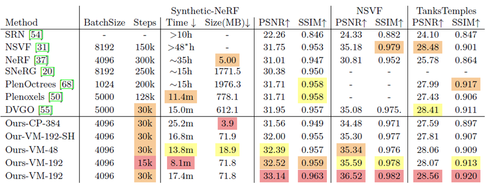 기존 Grid-based 연구와 학습 속도는 유사하였지만, 높은 PSNR을 보였고, 무엇보다 적은 모델 사이즈라고 강조하고 있습니다.