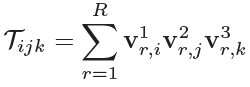 v는 vector를 의미하고, 우상단은 차원(=Tensor) 번호를 의미합니다. 1을 x, 2를 y, 3을 z로 봐도 되겠네요. r은 rank를 의미하고, i,j,k는 각 차원의 길이를 의미합니다. 위에서 설명한 것과 같이, 1차원 vector 3개에 대한 Outer Product(외적)의 합으로 3차원 T를 표현합니다.