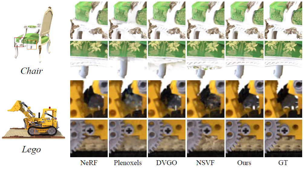 Our-CP-384는 CP decomposition으로 384 rank components를 가져갔을 때의 결과, VM-192-SH는 VM Decomposition으로 192개의 rank components를 갖고 가고 MLP가 아닌 Spherical Harmonics함수를 사용했을 경우를 나타냅니다. VM-192는 MLP를 사용한 케이스에 해당되며, 모든 평가 데이터셋에 대해 가장 높은 PSNR을 갖고갑니다. VM-192에 대해서 15,000 iteration만 진행했을 경우에 8분이 소요되는데, 기존 연구보다 높은 PSNR을 보이고 있습니다. 그리고 TensoRF 논문에서 가장 강조하였던 Memory 부분을 보면, 다른 연구들 대비 확연히 다른 크기의 적은 사이즈를 확인 할 수 있습니다. 아래는 Synthetic-NeRF 데이터셋에 대한 결과 이미지입니다.