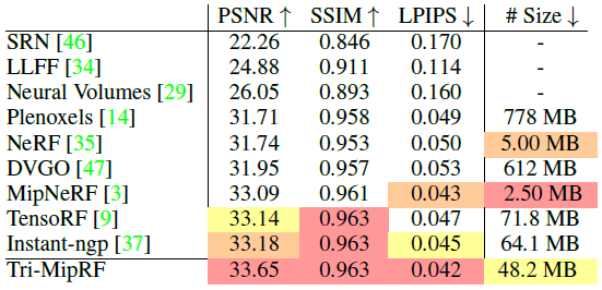 퀄리티가 우선인 연구들(NeRF,MipNeRF) 보다는 메모리가 많이 사용되지만, Grid기반으로 속도를 향상시키는 연구들(Plenoxels, TensoRF, Instant-ngp) 보다는 메모리가 적게 사용되는 것을 볼 수 있습니다.
