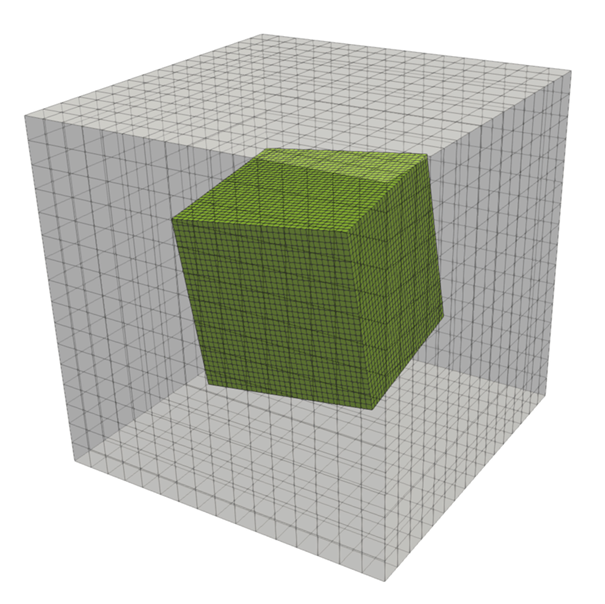 예시를 통해 설명하겠습니다. 초록색 object를 mesh형태로 만들고자 합니다. 3D 공간은 작은 단위의 투명색 cube로 표현 할 수 있습니다. 아래 예시는 16x16x16의 cube grid로 구성되어 있습니다. (그림 출처 : link)