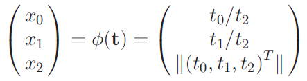수식으로 보면, camera 좌표계 내 point t를 image 좌표계(camera좌표계에서 z축에 해당되는 t2가 1인 평면) 내 x로 mapping하는 함수를 Φ라고 할 때, 아래와 같이 정의되며, 이러한 형태는 Affine 변환(Ax+b형태의 선형 변환)이 불가능 한 것을 볼 수 있습니다.