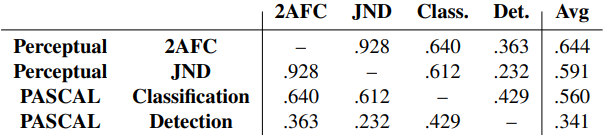 - 2AFC와 JND는 사람이 다른 2개 방법으로 평가하였기에, 92.8%로 correlation이 높습니다. 그에 비해 2AFC와 Classification는 64%, 2AFC와 Detection은 36.3%의 correlation을 가졌습니다. 2AFC는 "Low-level"인 Percetual Task입니다. Classification과 Detection 둘다 "High-level" Semantic Task이지만, 둘 사이의 correlation은 42.9%였습니다.