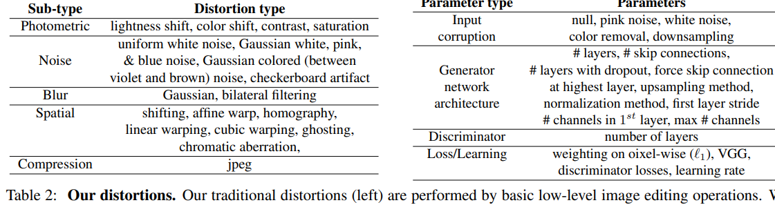 - CNN-Based Distortion : 아래 오른쪽 표에 명시한 paramters를 랜덤으로 다양하게 하여 96개의 denosing autoencoder를 구성하고, 1300만개의 ImageNet 데이터셋으로 1번 학습시켰습니다.