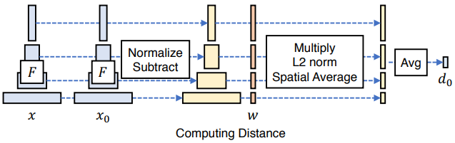 - 2개의 이미지 Patch(x,x0)를 Network에 통과 시켜, 각 Layer의 Feature Vector의 값을 아래와 같이 추출하여 거리를 비교하였습니다.