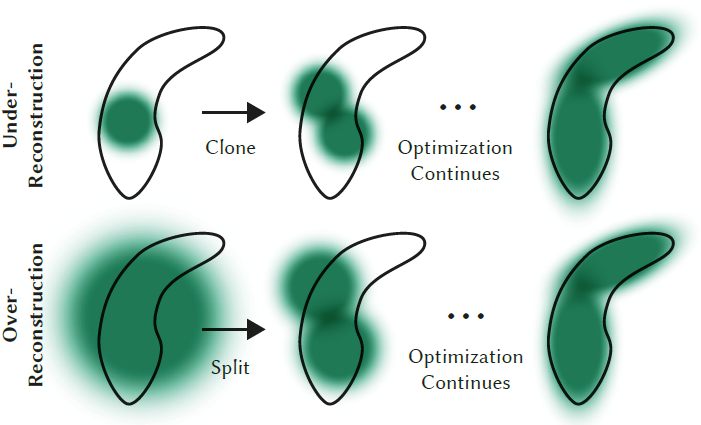 Clone Gaussian : Under-Reconstruction 영역에 대해서, 작은 크기의 (=covariance가 작은) 3D Gaussian들은 같은 크기로 copy되고, positional gradient의 방향에 배치되게 됩니다.