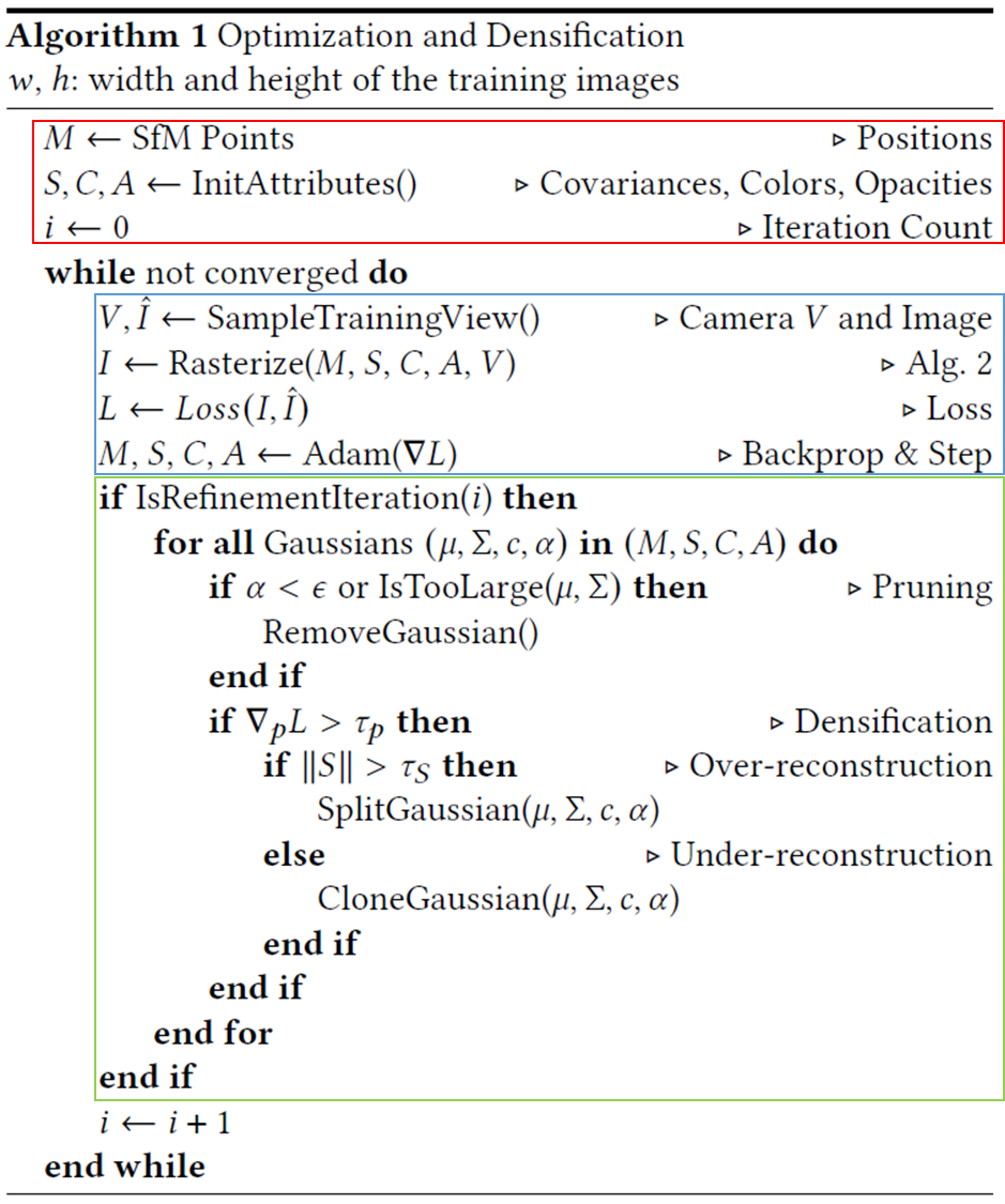 - 세번째 부분(초록색)은 Gaussian을 직접적으로 다루게 되는데, 특정 iteration마다 Gaussian을 Clone하고 Split하고 Remove하는 부분입니다.