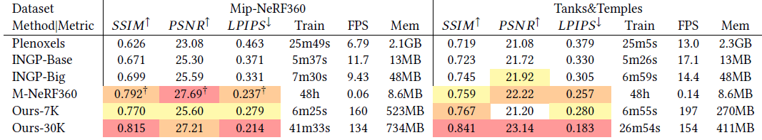 Mip-NeRF360은 A100 4장을 사용하였고, 나머지는 A6000을 사용했다고 합니다. FPS는 랜더링 시간을 의미합니다. 3D Gaussian Splatting을 Instant-NGP와 비교하였을 때 Train속도가 비슷하나, PSNR이 높고, 무엇보다도 랜더링 속도가 매우 빠릅니다. 랜더링 속도 관점에서 Instant NGP가 10FPS 정도면 괜찮지 않을까 싶은데, high-spec의 gpu를 사용한 속도이기 때문에, 저가형 GPU로 바뀔 경우 버벅거림이 발생할 수 있습니다. 단점으로는 이전 기법과 달리 memory가 상당히 많이 쓰이는 것을 볼 수 있습니다. 학습 과정에서 매우 큰 Scene에서는 GPU 메모리가 20GB까지 사용 되었다고 합니다. 때문에 소스코드에서는 24GB 이상 GPU램을 사용하라고 명시되어 있습니다. 작은 Scene의 경우, 더 적은 메모리를 가진 GPU를 사용 해도 됩니다.