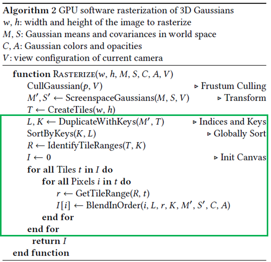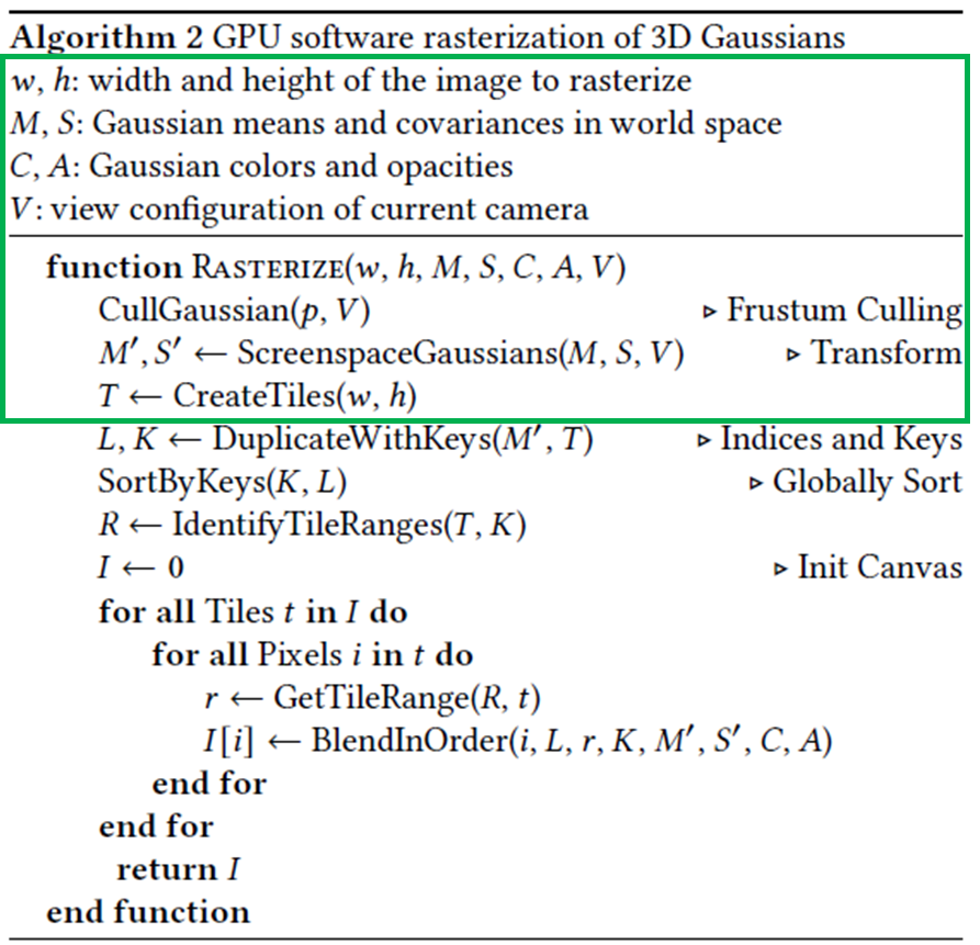 Cull Gaussian : 주어진 camera view에서 관측 될 수 있는 3DGaussian들만 선택합니다. 카메라 중점에서 절두체(View Frustum)를 그리고, 필요없는 것은 제거(culling)하기 때문에Frustum Culling이라고 하는 것 같습니다.