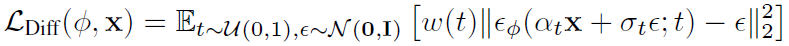 네트워크Φ 결과값과 입력이미지 x 간의 차이(diff)를 찾는 수식으로 정의되며, time t가 0~1 실수범위에서 uniform하게 얻어지고, 가우시안분포인 ϵ로 [ ]안의 값을 샘플링하였을 때의 기대(평균)값을 계산하는 수식으로 정의됩니다. w(t)는 time t에서의 가중값을 의미하고, ϵΦ는 U-net network로 reparameterization trick을 사용해서 확률분포를 입력이미지(x) + 표준편차(σ)*가우시안분포(ϵ) 수식으로 변형해서 network의 입력값으로 사용됩니다. 이 network의 결과값은 가우시안 분포(ϵ)를 따르도록 설계됩니다. 가우시안 분포를 따르지 않을 경우 Loss가 커지게 됩니다.