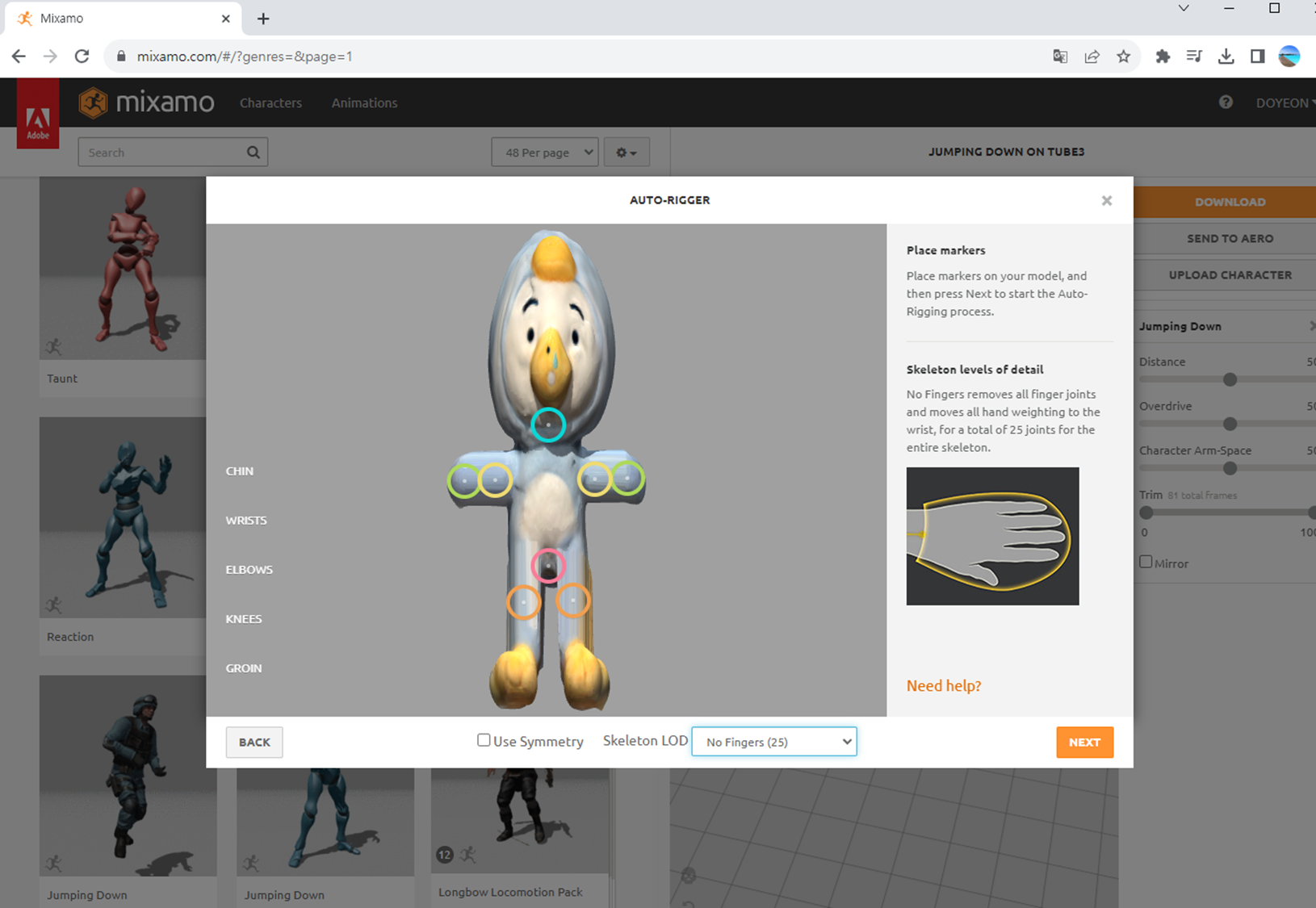5. adobe의 Mixamo link에 fbx를 업로드하고, 팔,다리 위치를 설정해줍니다.