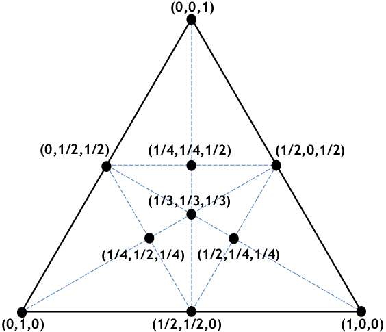 삼각형의 정점을 (1,0,0), (0,1,0), (0,0,1)로 두었을 때, 삼각형 내부 점의 위치를 정점 3개의 좌표에 떨어진 비율로 표현하고 있습니다.