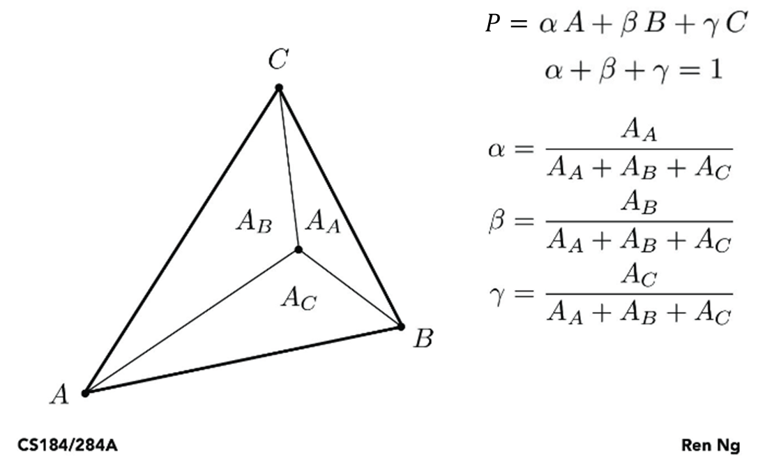 Barycentric Coordinates는 삼각형의 내부의 점을 표현하는 좌표계입니다. (그림출처 : link)