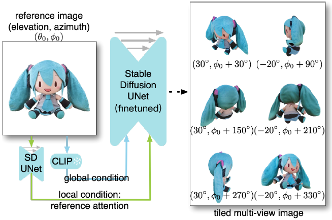 - 첫번째 UNet은 Stable Diffusion에 기반하여, 미리 정의한 카메라 각도에 따른 이미지들을 생성합니다.