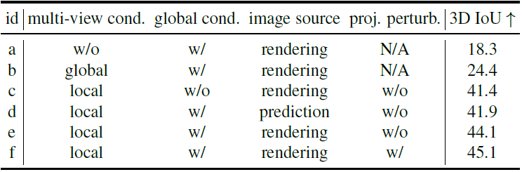 b) Multi-view condition을 local이 아닌 global로 사용 할 경우도 성능 하락이 큽니다. a-b의 경우 local feature로 사용하지 않기 때문에 perturbation(=작은 노이즈) 적용이 고려되지 않습니다. (global일 경우엔 쓸 것 같은데, N/A인 이유를 정확히 모르겠네요.)