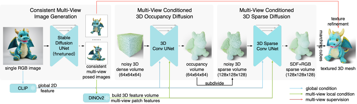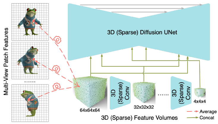 위 그림에서 (Sparse)라는 글자가 보이는데, 괄호를 빼면 3번째 UNet(3D Sparse Diffusion)에 해당합니다. 한개 그림으로 2개 Network를 나타내려한 것 같습니다. 물론 128^3 그림도 추가되어야 합니다. 혼동을 주는 그림이라 부연설명을 해봤습니다.