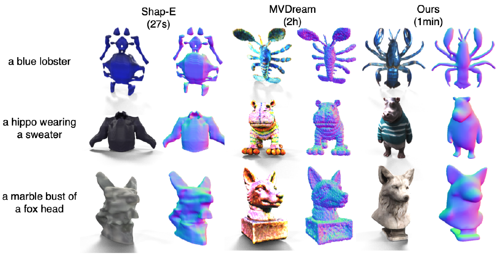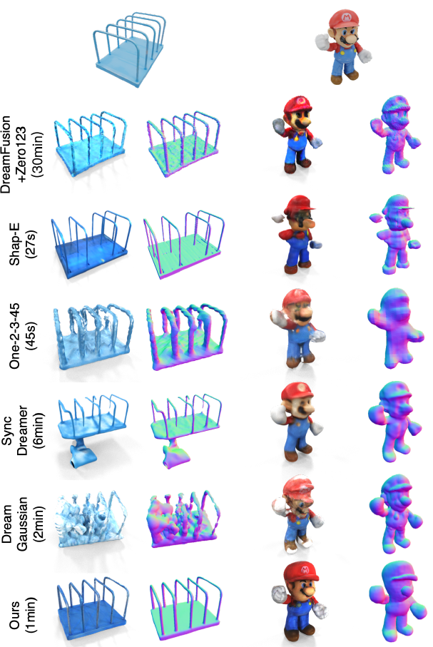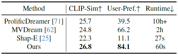 집에 있을 만한 사물 1030종을 스캔한 GSO(Google Scaned Object)를 기반으로 평가를 진행했습니다. F-Score는 예측값과 정답간의 Geometric 유사도를 평가하였고, Clip-Sim은 24개의 서로 다른 카메라 포즈에서 랜더링하고, CLIP모델에 넣었을 때 나오는 feature값의 유사도를 평가하였습니다. User-Pref는 53명의 사람이 무작위로 샘플링해서 2385번 퀄리티관점의 선호도를 평가했습니다. 모든 지표에서 가장 높은 성능을 보이는 것을 볼 수 있습니다. One-2-3-45와 Shap-E보다는 느립니다. User-Pref가 특히 높은데, 제가 봐도 퀄리티 관점에선 최고라 생각됩니다.