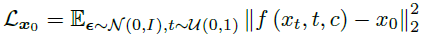 0~1구간에 Unifrom하게 획득하는 step t와, Gaussian분포를 가진 ϵ의 기대값에 대한 Loss입니다. x0는 목표로 하는 확률 분포를 의미하며 xt는 step t에서 noise가 들어간 volume, c는 condition값입니다. 각 단계에서 예측값과 x0의 차이로 Loss가 설계가 되어집니다.