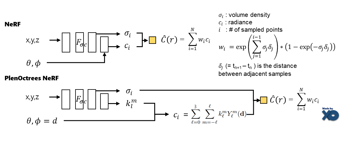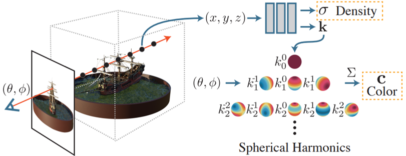 기존 NeRF와 비교하여 다시 설명하자면, radiance 값에 대해, Neural Network의 결과를 곧바로 사용하지 않고, coefficient(k)와 view direction(d)을 입력으로 받는 SH함수로 계산한다는 점입니다.