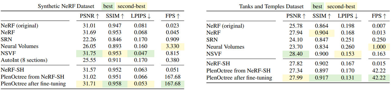 - 퀄리티는 original NeRF보다 약간 좋고, 랜더링 속도는 3000배 향상되었습니다.