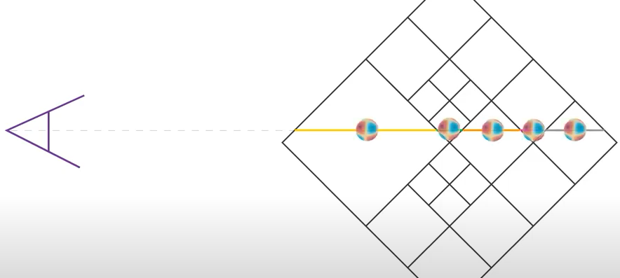 - 1) Octree구조에서 ray를 그려 density, color를 가진 voxel grid를 구분합니다. 위 그림에서 각 네모가 voxel grid를 의미합니다.