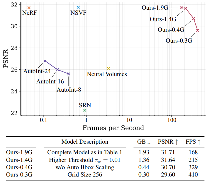 - Rendering 속도 대비 PSNR을 비교하였을 때, Trade-off가 있었습니다. Table1은 위에 테이블을 의미합니다. GB는 Tree의 메모리를 의미하는 것으로 보이며, grid size 256은 512^3에서 256^3으로 줄었다는 것을 의미합니다.