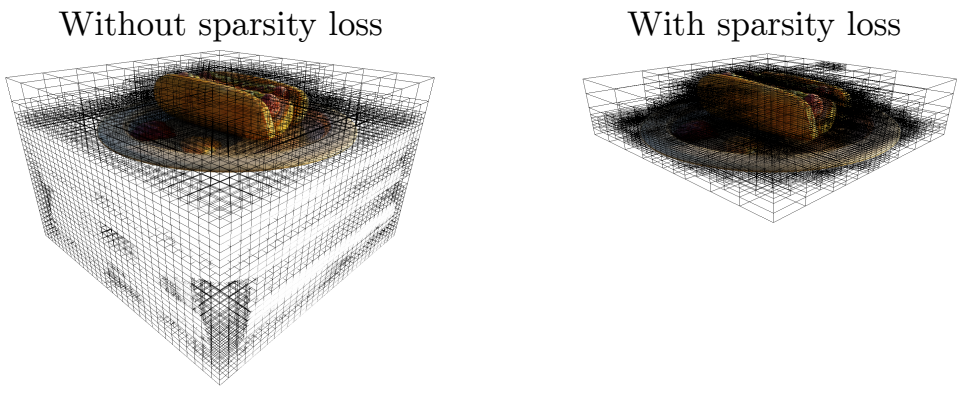 Sparsity Prior Loss 추가 : 기존 NeRF에서 관측되지 못한 Voxel영역들은 임의 geometry값으로 채워지며, 퀄리티에 큰 영향을 미치지 않았습니다.
