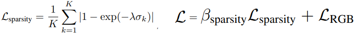 하지만 뒤에 소개 할 conversion process에 영향이 있어, 아래와 같은 sparsity prior Loss를 추가하였습니다. K는 한 개 Ray에서 sampling한 point의 개수 이고, σ는 volume density이고, λ, Βsparsity는 상수입니다.