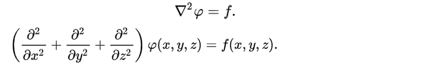 위 공식을 통해, 함수 f가 주어지면 함수φ를 찾을 수 있습니다. 둘 다 Vector Field이므로, Divergence(▽)를 취할 수 있으며, 양변은 Scalar Field가 됩니다. (참조: ▽ 설명)
