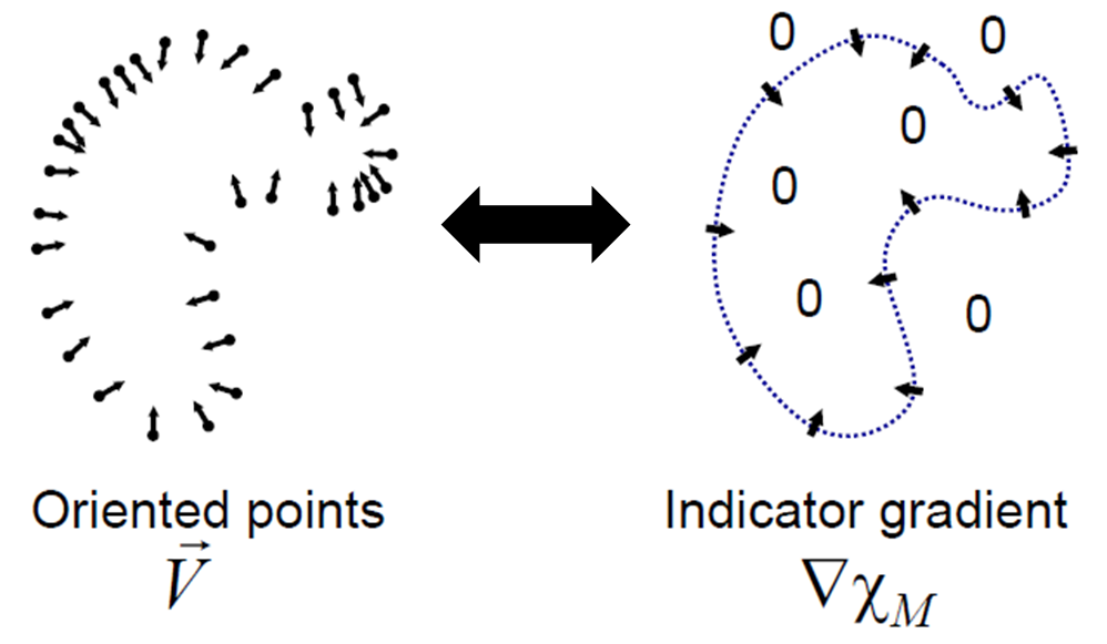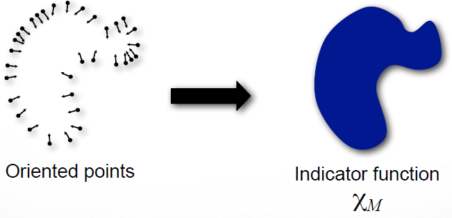 스칼라 함수인 Indicator Function에 Gradient(▽)를 취하면 Vector함수가 되므로(참조: ▽ 설명), 이 Vector함수와 Oriented Points가 Relationship(관계성)을 갖게 된다는 점을 활용합니다. Oriented Points를 Approximation하는 Indicator Gradient를 찾는 문제가 됩니다.