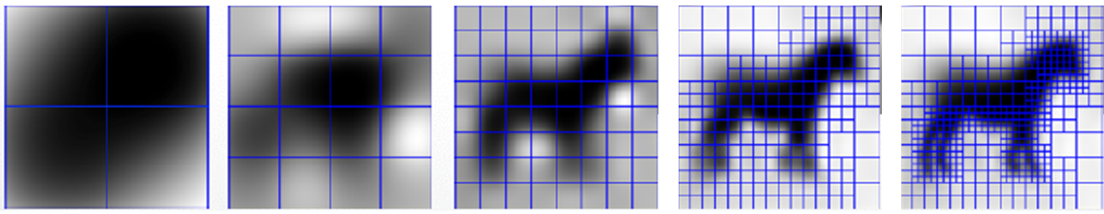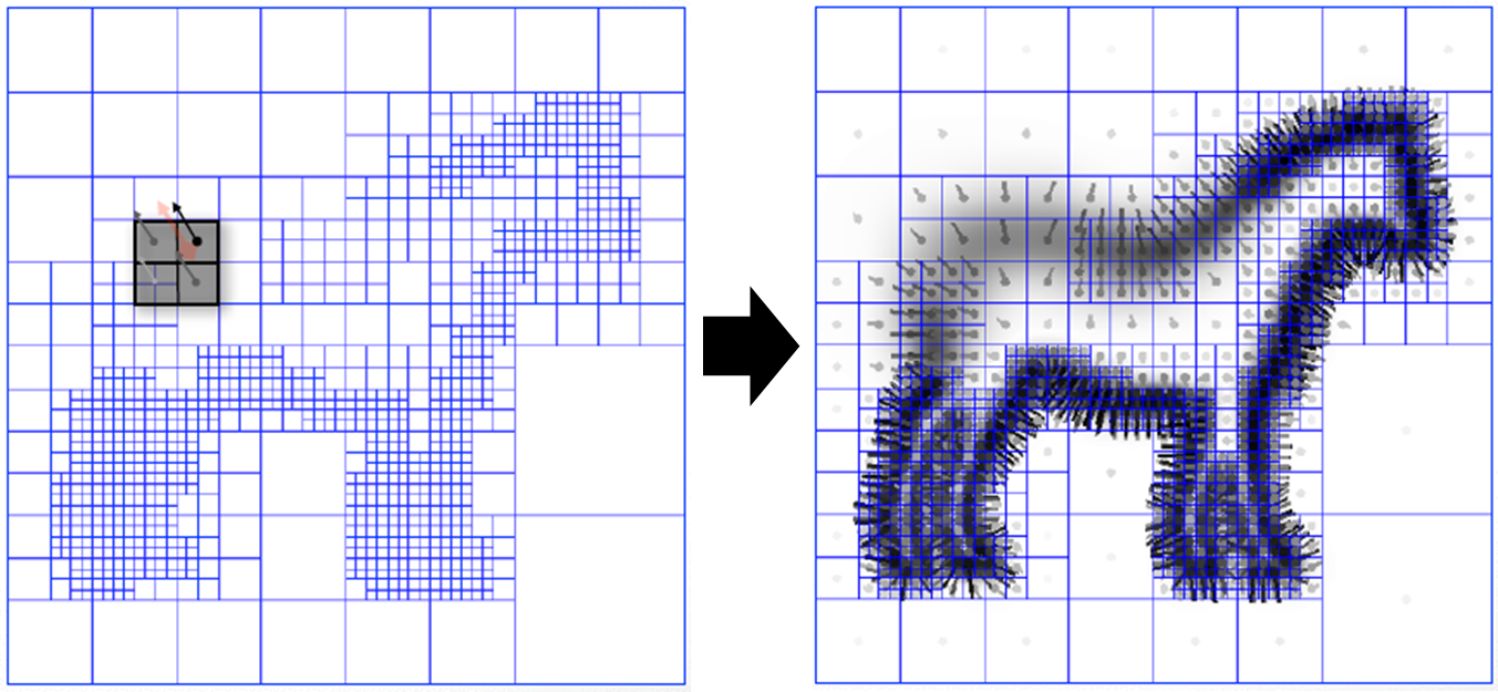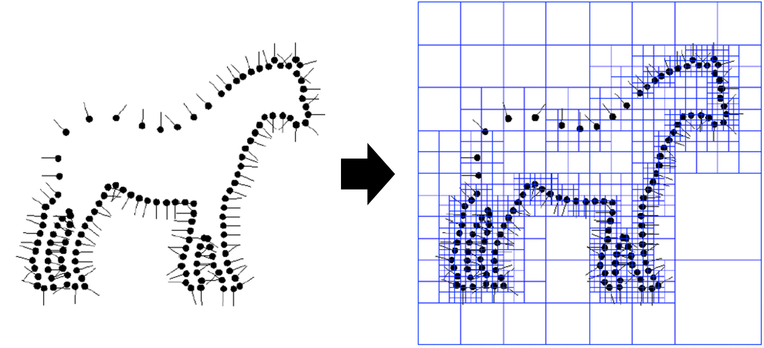 방향(Oriented)이 주어진 Point Cloud(왼쪽 이미지)가 주어지면, 모든 Point가 포함된 큰 육면체를 만들고, Octree를 사용해서 분할합니다. Octree는 3차원에서 6면체인 사각형을 8등분(x,y,z축으로 1/2지점 분할)하는 Tree입니다. Point가 있으면 8개의 자식 node로 분할하는 형태입니다. 실제 3차원이지만 아래 이미지는 2차원으로 간단하게 표현한 형태입니다.